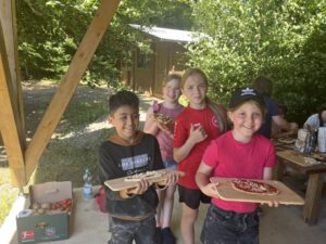 Kurz vor den Ferien war es endlich soweit. Immer wieder sprachen die beiden AG‘s, die sich mit der Natur verbunden fühlen, davon, etwas gemeinsam zu unternehmen. Am Ende des Schuljahres übernahm Förster Veit Meyer und seine Kollegin Karla Vogel die Initiative. Die Wald AG kaufte die Zutaten ein und man traf sich gemeinsam in der Waldschule beim großen Backes. Wenn am Anfang noch die Ungeduld auf die leckere Pizza groß war, vielleicht zu groß, so wurden Pizza für Pizza immer besser belegt und durch die Raucharomen im Backes, immer schmackhafter. Herr Mc Clellan schaute auf die Uhr und flott wurde aufgeräumt. Mit fortgeschrittener Zeit war ein kleiner Dauerlauf bis zur Schule von Nöten und die Kinder bekamen ihre Anschlussbusse um 16:00 Uhr. An dieser Stelle möchten wir uns für die gut vorbereitete Aktion und für den finanziellen Aufwand seitens des Forstamtes bedanken.